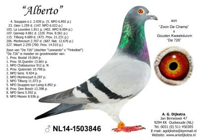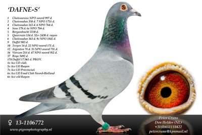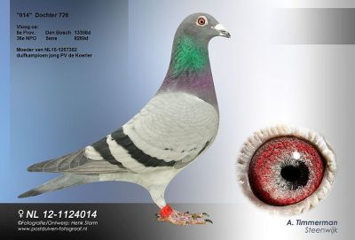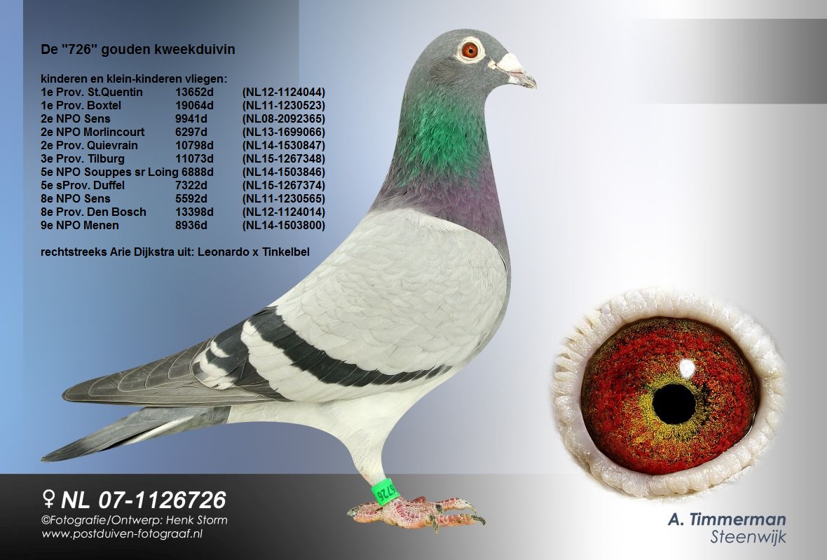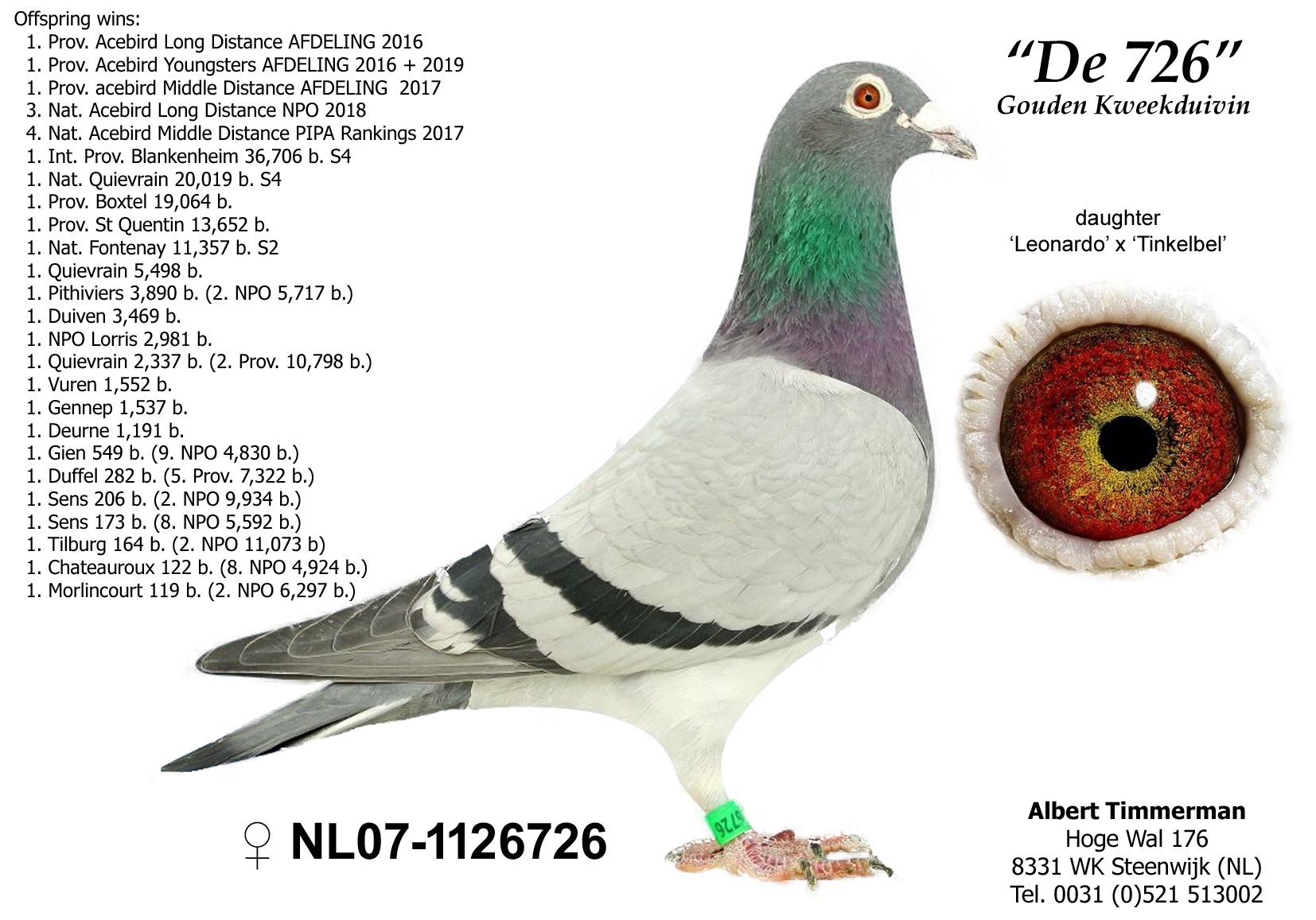 De 726 werd “gekocht” in 2007 bij Arie Dijkstra. Zij is een dochter van het superkoppel Leonardo x Tinkelbel. Dit koppel stond in 2007 voor het eerst op elkaar. De vaste partner van de 726 is de NL07-1962459. Samen hebben ze hier voor veel goede nazaten gezorgd. Het mooiste van alles is echter dat bijna alle kinderen ook weer goede duiven geven. De erfkracht van deze duivin is bijzonder. Helaas is ze van 2007 , wat dus betekent dat deze bikkel niet veel eieren meer zal leggen. In 2016 heeft ze nog 5 jongen gegeven. Die zijn direct naar mn kweekhok gegaan. Toch in 2017 ook weer 5 jongen, niet meer met haar vaste partner maar tegen jongere doffers.