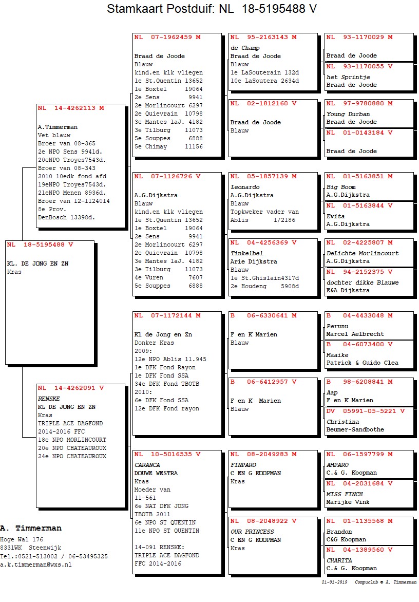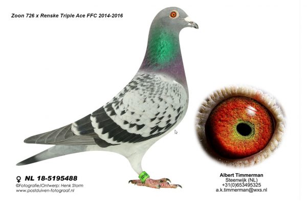 NL18-5195488admin2025-01-31T16:22:48+01:00 488 dochter van topduif Renske Deze duivin heb ik gekregen van Klaas en Jacob de Jong uit Ee. Ze komt uit topduivin Renske die over de jaren 2014,2015 en 2016 Asduif dagfond was in de Friese Fondclub.